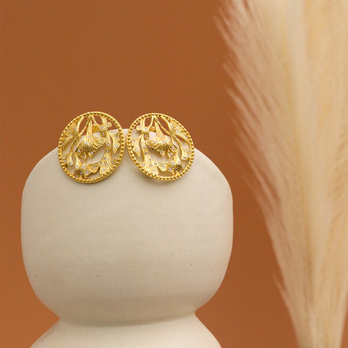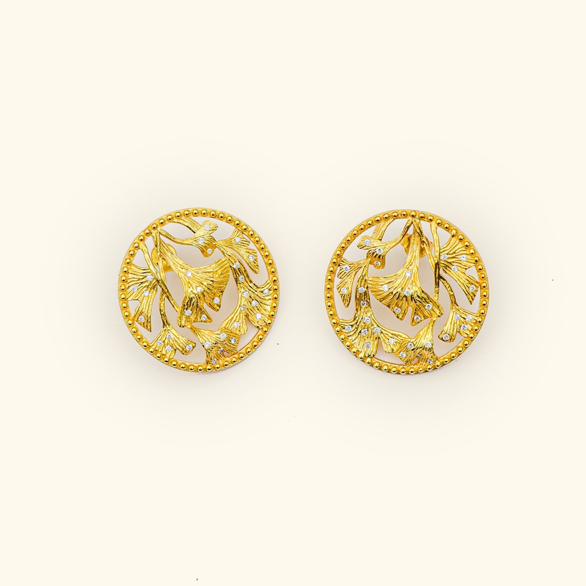 Ginkgo Glam Circlets are exquisite earrings that redefine the art of making a statement. Featuring delicate ginkgo leaves within circular frames, each leaf is adorned with shimmering stones, adding a captivating touch of shine. These earrings embody nature’s beauty and luxury in one captivating design.